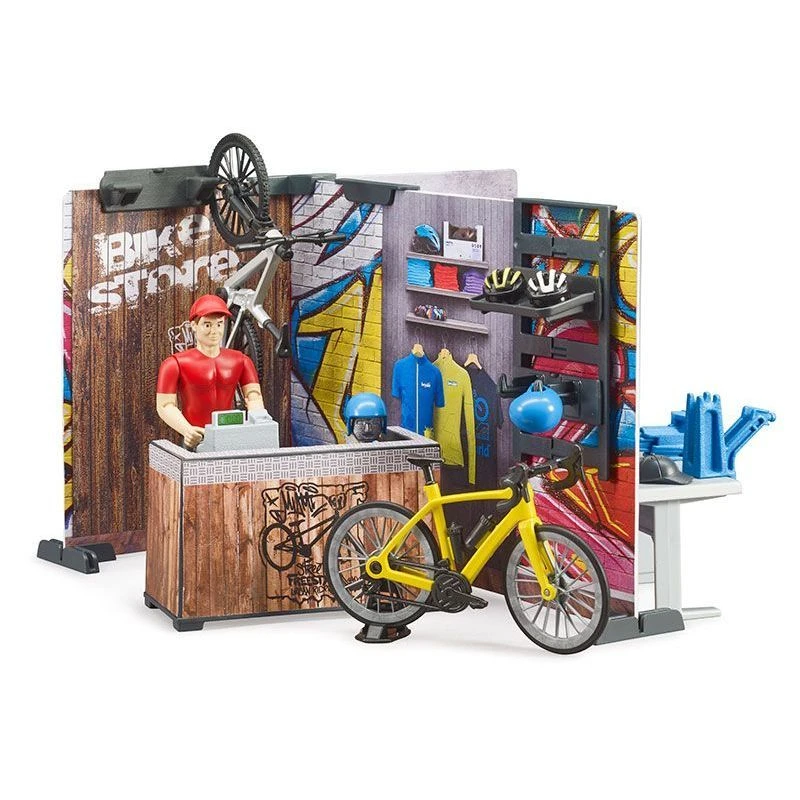 There is a new port of call for the many sports-loving bworld figures. The new bworld bikeshop from BRUDER has everything you would expect from a modern bicycle shop. In the comprehensively equipped workshop, bicycles can be fully serviced. There are assembly stands and a workbench including tools available for this purpose. In the shop, you can browse the shelves and look for new accessories or even complete bicycles. Expert advice is provided by the bworld figure, which is also included. The bworld bike shop can be easily combined with the other bworld themed sets. The bworld racing bike rider (item no. 63110), bworld mountain bike rider (item no. 63111) and Jeep Wrangler Rubicon, as well as the BRUDER Roadster with corresponding bicycles (item no. 02543 + 03485) are particularly fitting additions from the wide BRUDER selection. bworld is the toy world of BRUDER. It is made up of moving figures, animals, accessories and, most recently, also themed sets, and is assigned to the well-known BRUDER categories. Whether as a driver, rider, water sports enthusiast, or in the hospital ward or motorcycle workshop, bworld items provide hours of fun on their own or make the perfect addition to the detailed vehicles. With the new themed sets you can dive even deeper into the world of Bruder. Printed wall elements with easy-to-mount adjustable feet now form the space for even more reality when playing and the new shelving system can also interact with the elements.