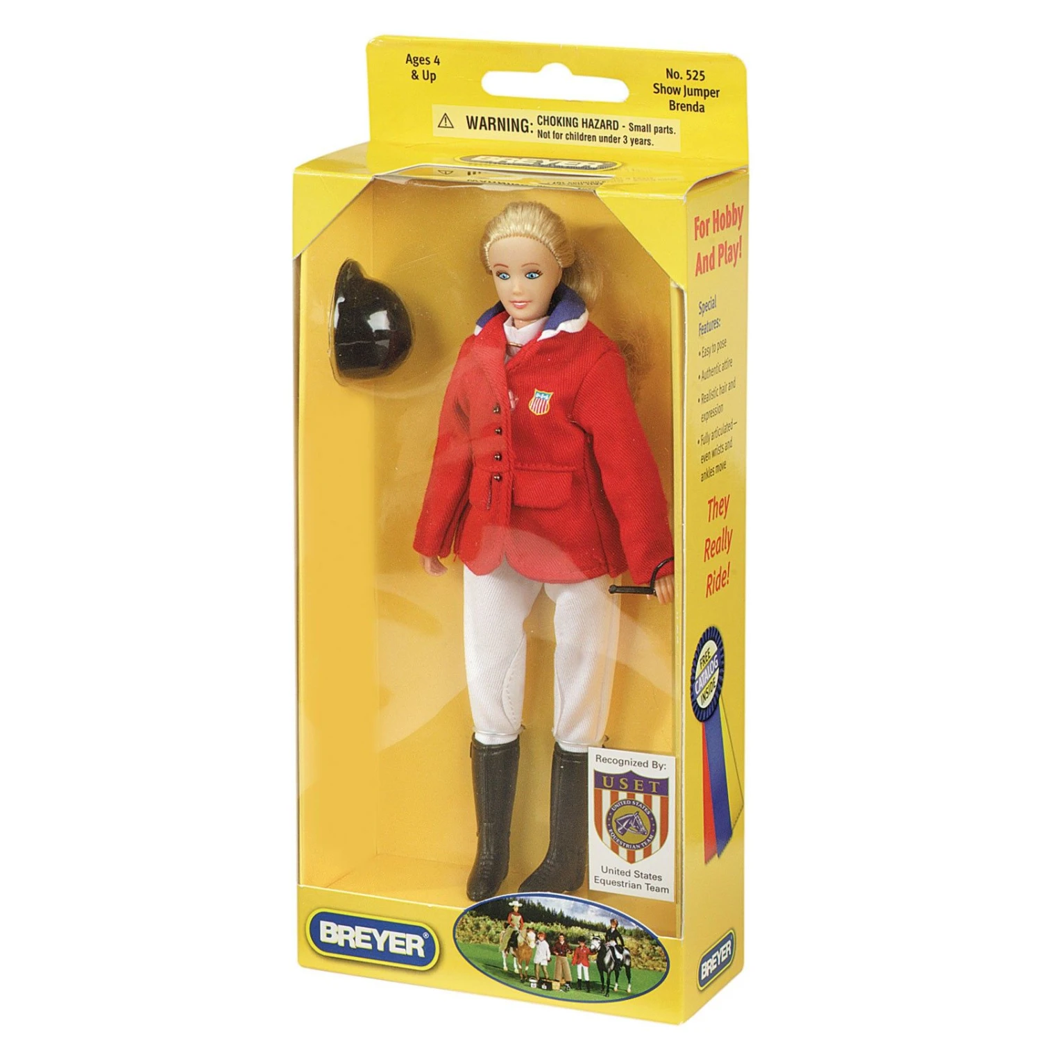Brenda wears the official riding outfit of riders who represent our nation at international competitions and Olympic competition. The traditional scarlet coat with blue and white collar, USET emblem, white breeches and black boots complete the picture. Fully articulated, she can really ride!