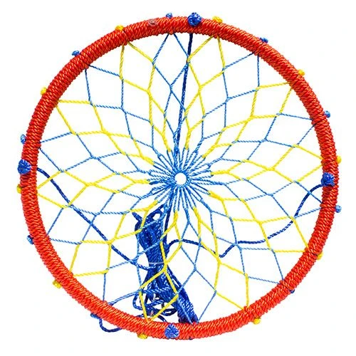 Colorful Sky Dreamcatcher Swing will take children soaring in their own backyard adventure! They can swing, twirl and spin as far as their imaginations will take them! No Assembly required and easy installation. Hang from 2 points or a single point for more spinning action. Easily holds several children. Includes uniquely colored 38” diameter hand-woven swing using UV resistant nylon with steel frame. 8-ft adjustable nylon rope and 2 carabiners. Maximum weight 500 lbs.