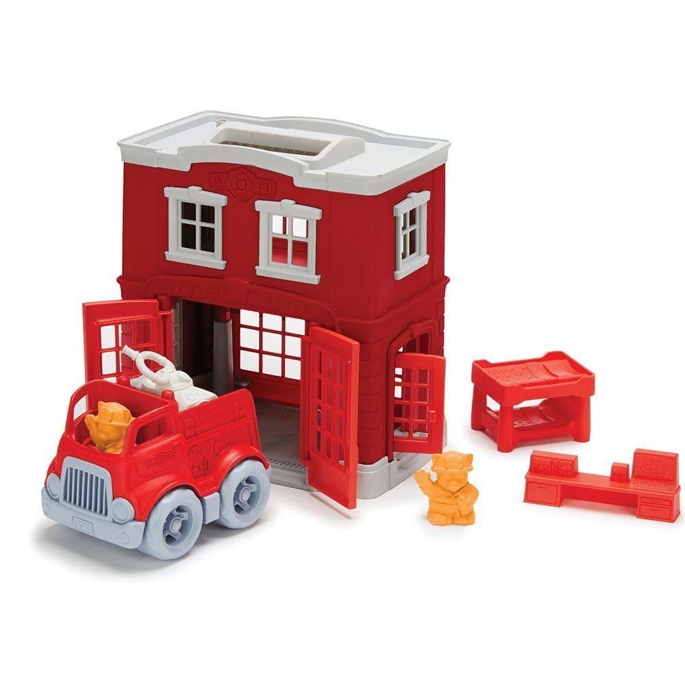 Spark imaginative play with the Green Toys Fire Station! This playset has everything your little firefighter needs to save the day, including a fire station, fire engine, firefighter cat characters, rotating water cannon, command center, and stackable bunk beds. Open and close the doors to both the front and back of the station, help the cats slide down the fire pole, and race to the rescue in the fire engine, all while helping to develop fine motor cooperative play skills. All pieces fit inside the fire station, so clean-up and storage is a breeze, and the built-in handle makes it easy to take all the fun on-the-go. Made in the USA from 100% recycled plastic with no BPA, phthalates, or PVC. Dishwasher safe. Packaged with recycled and recyclable materials printed with soy inks. New 2016