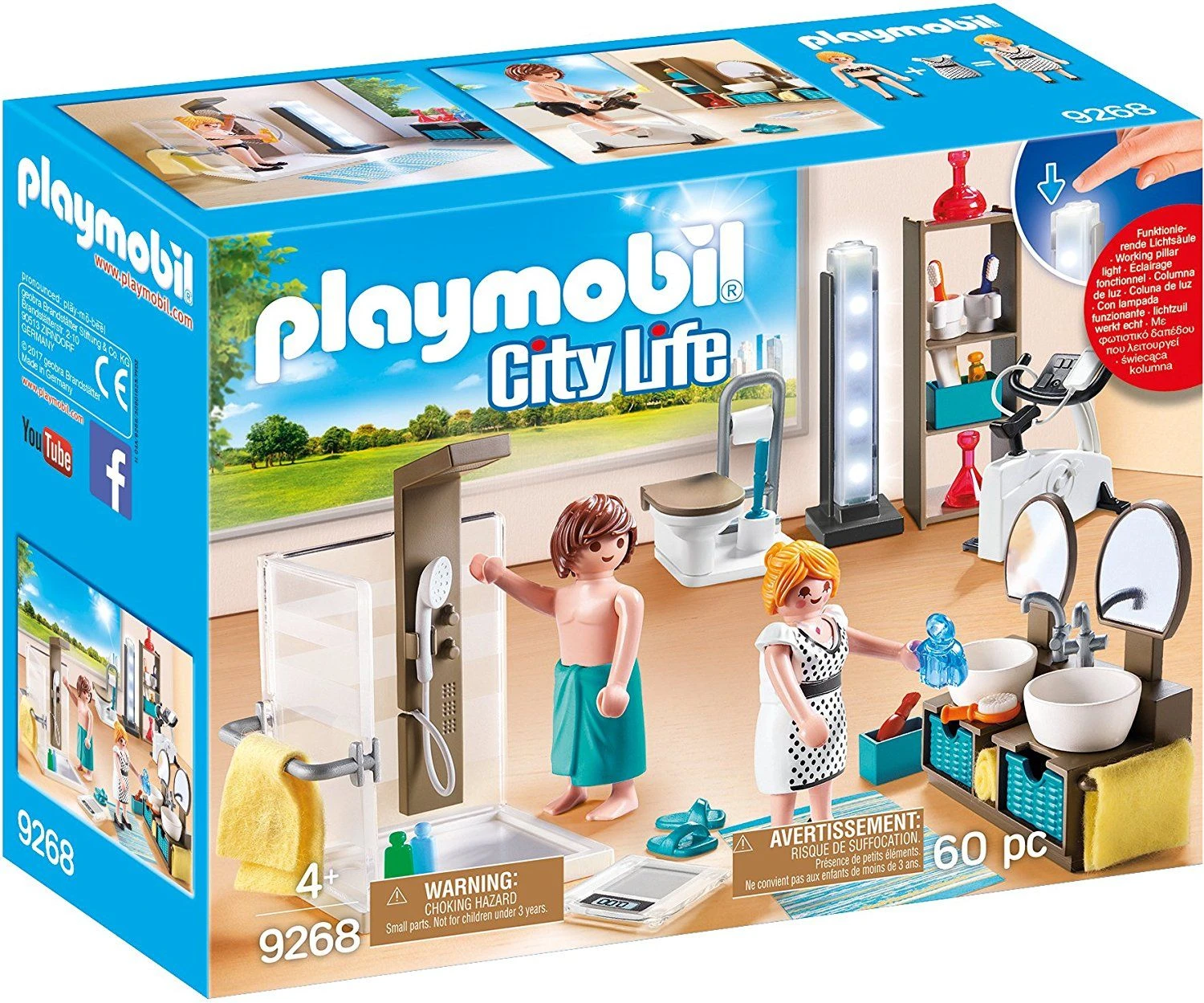 Freshen up for a big day in the bathroom. Start out by getting in a workout on the exercise bike before hitting the shower. There is plenty of room under the double sinks and on the shelving unit to store all your toiletries and cosmetics. The functioning column lite makes it easy to find your way around. Set includes two figures, exercise bike, toilet, two sinks, shower, weight scale, shelf unit, storage baskets, toothbrushes, toothpaste, hairdryer, comb, interchangeable dress, and lots of other accessories. Combine this set with the modern house (9266 – sold separately) for added fun. New 2018