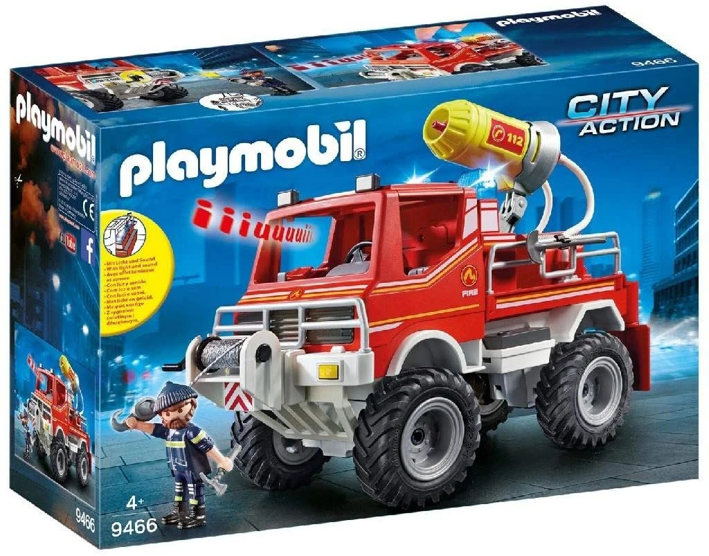 No terrain is too tough for the fire truck. This all-terrain firefighting vehicle is equipped with flashing lights and sounds (3 x AAA batteries required) and is always ready to handle a forest fire or other non-traditional firefighting call. The rotatable water cannon is designed to blast water far distances and the included rescue winch can help any car out of a sticky situation. Combine this set with the firefighters with water Pump (#9468 – sold separately) for even more fun. Set includes one figure, walkie-talkie, shovel, and other accessories. Dimensions: 10.2 x 4.7 x 6.7 in (LxWxH). recommended for ages four years and up. Warning. Choking HAZARD. Small parts. Not for children under 3 years.