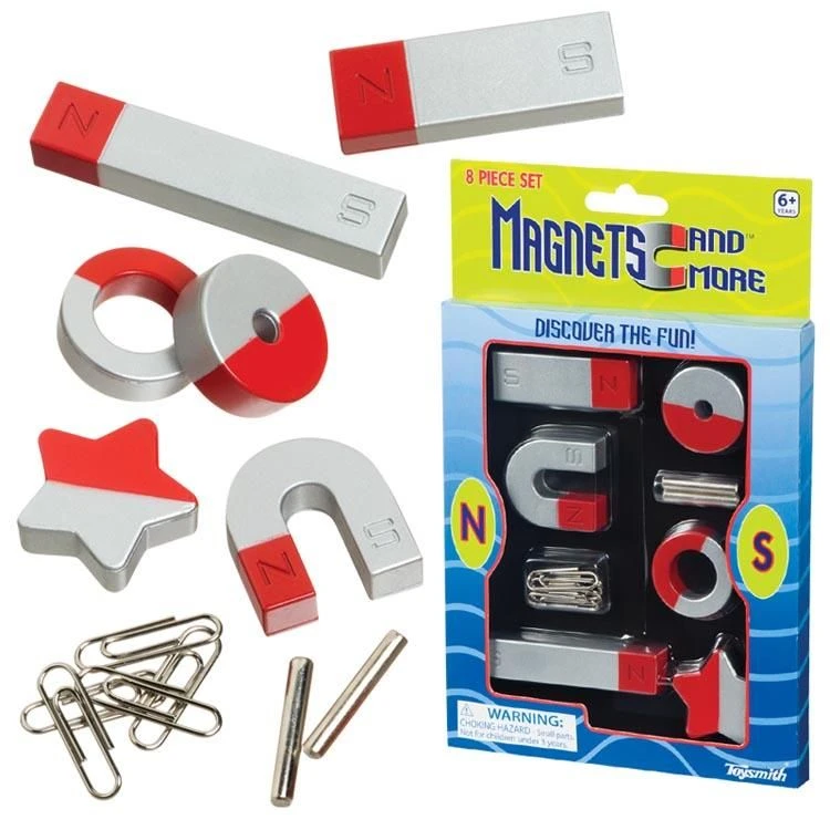 Harness the power of magnets! This set of magnets includes two 3 3+4” horsehoe magnets, five magnetic marbles, 7 1+2” magnetic wand and two star- shaped magnets, two mini horsehoe magnets and two round magnets.