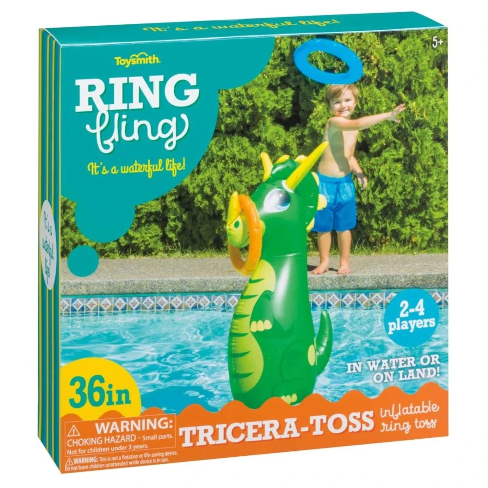 From Toysmith’s line of water toys, including the popular Bobbin’ Buddies Mer Kitty, comes the popular Tricera-Toss Inflatable Ring Toss Pool Game. Includes an inflatable green and light-green triceratops with three horns and 4 inflatable 10-inch diameter rings. Rings are blue and orange. Made with high-quality plastic, these toys are completely waterproof and durable for both water and outdoor grass play. The Tricera-Toss Inflatable Ring Toss toy is made for 2 to 4 players.